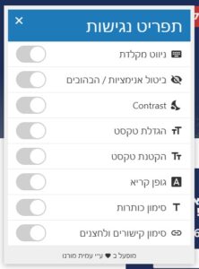 בלחיצה על הכפתור יפתח תפריט נגישות עם כלי עזר שונים: